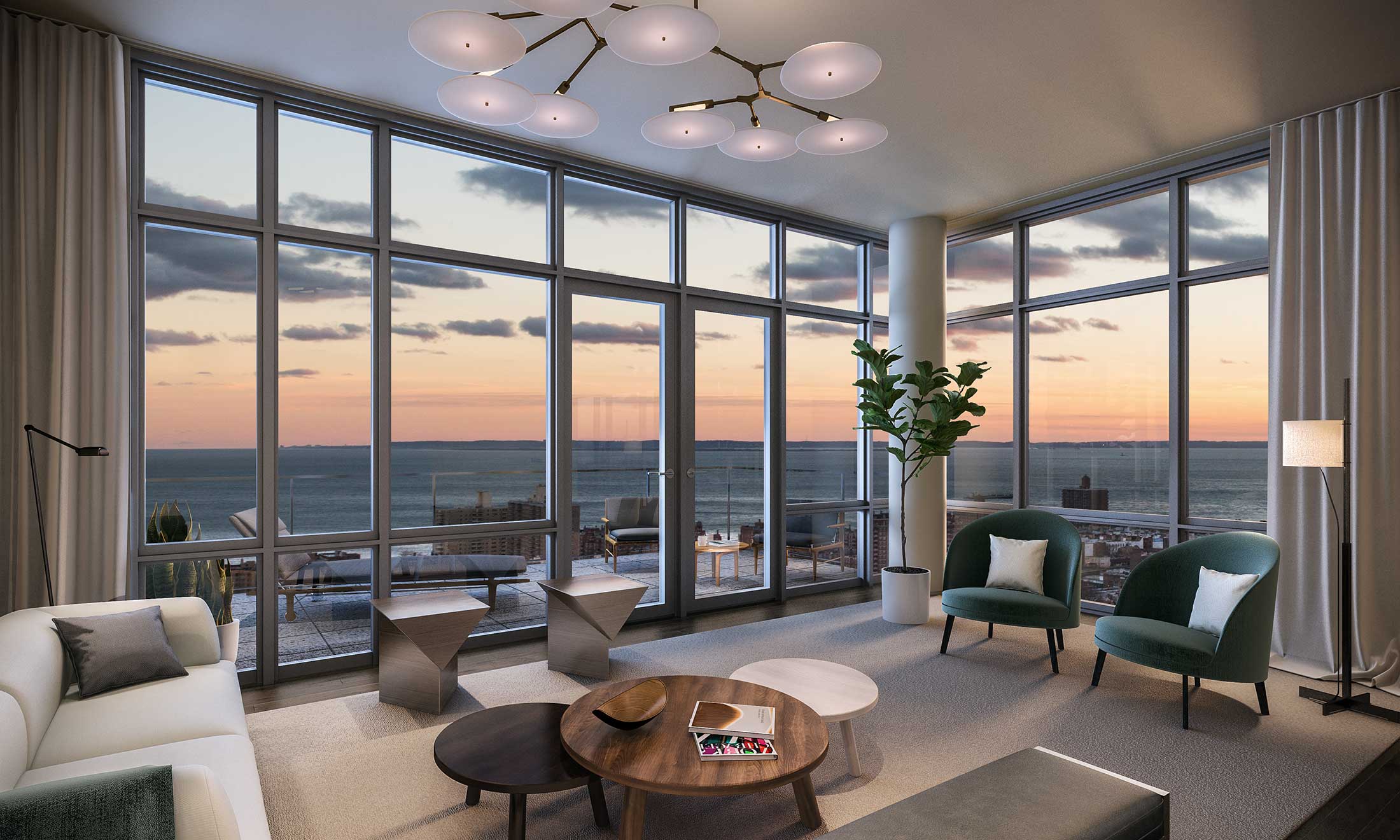 With ceiling heights of ten feet or more and sweeping floor-to-ceiling windows, airy living areas highlight endless ocean and city views.